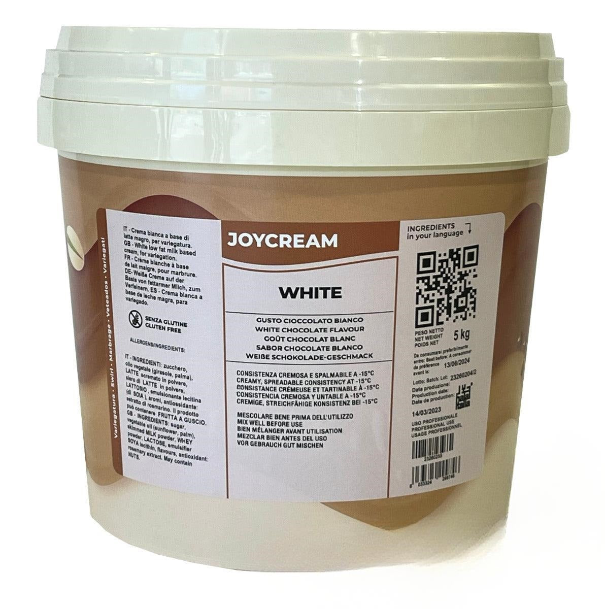 Disfruta de JOYCREAM WHITE, una deliciosa crema de chocolate blanco perfecta para personalizar tus postres como gofres, crepes, tortitas y pancakes, además de helados, batidos y churros. Esta crema tiene una consistencia semilíquida que se mantiene incluso a -15 °C. Es libre de gluten, no contiene ingredientes modificados genéticamente ni grasas transgénicas, y puede contener alérgenos como soja, lácteos y trazas de frutos secos.