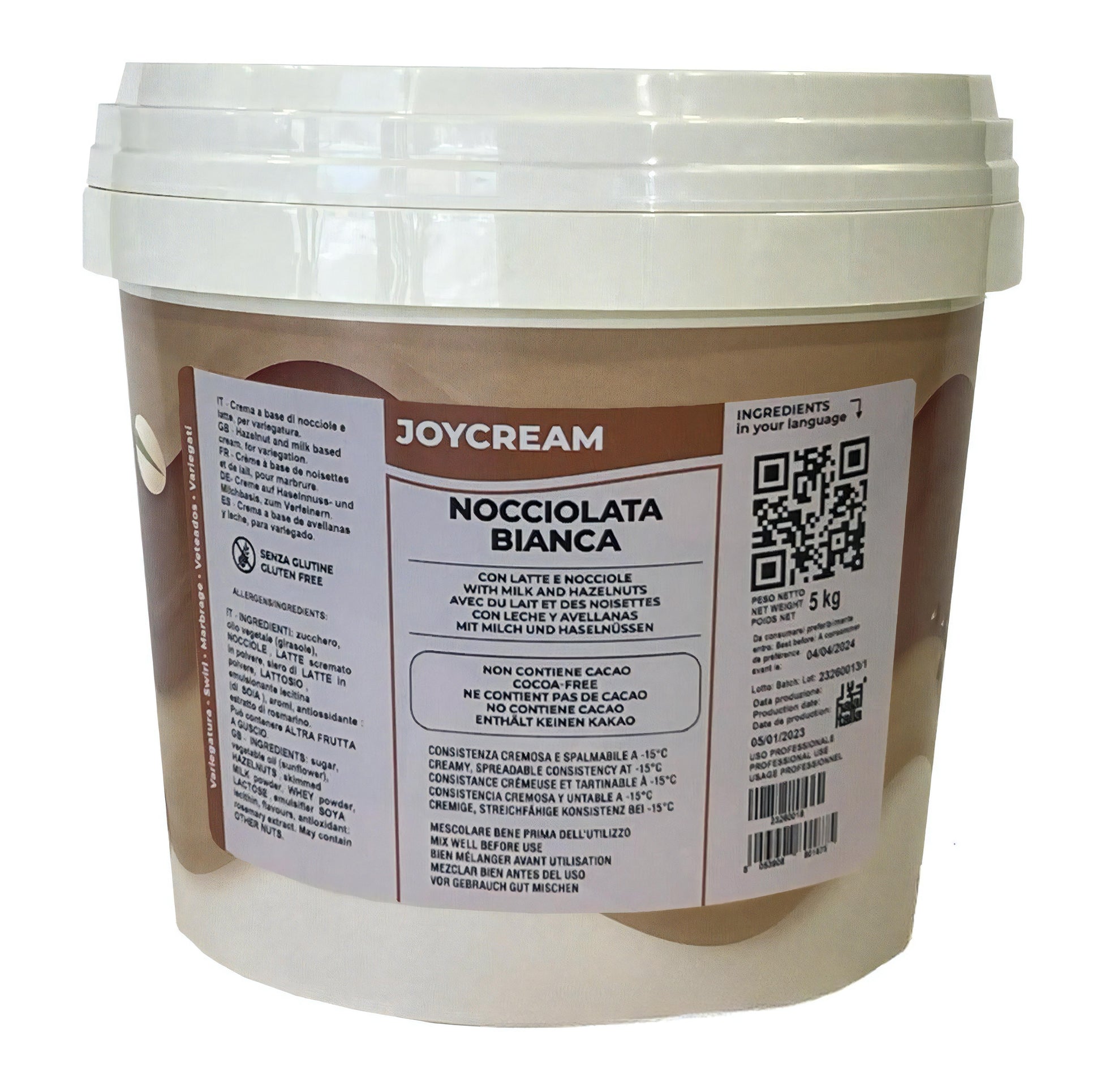 JOYCREAM NOCCIOLATA BLANCA CON AVELLANAS es una salsa suave con un delicioso sabor a chocolate blanco con avellana. Su especial fórmula mantiene su consistencia cremosa y fluida hasta -15°C, lo que la hace perfecta para vetear helados, decorar creps, tortitas, pancakes, bubble waffles, gofres, entre otros.