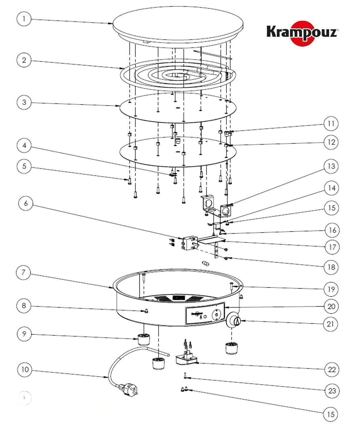 La resistencia tiene 3000W de potencia y está hecha con anillos cerámicos. Es la pieza de repuesto número 2 indicada en el plano de despiece y se identifica como SR0002. Esta resistencia es compatible con los siguientes modelos de creperas eléctricas Krampouz: